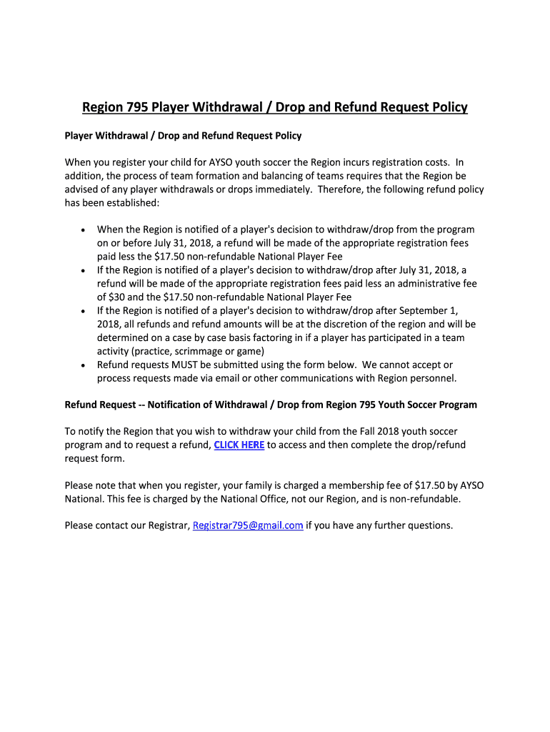 Region 795 Player Withdrawal / Drop and Refund Request Policy