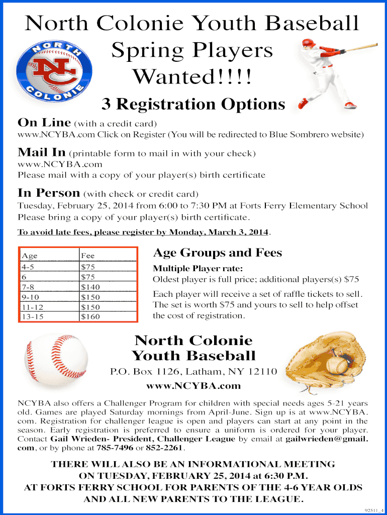 North Colonie Baseball forms can be filled out online or submitted in person at registration events.