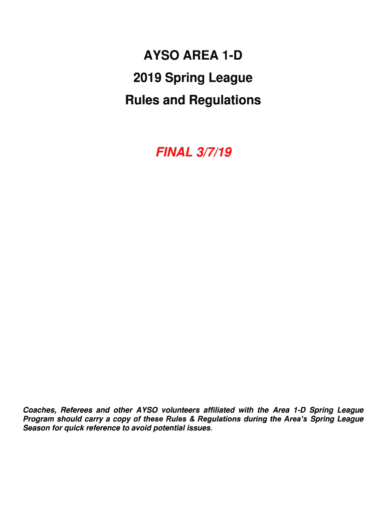 ALSO, AREA 1D 2019 Spring League Rules and RegulationsFINAL 3/7/19Coaches, Referees and other ALSO volunteers affiliated with the Area 1D Spring League Program should carry a copy of these Rules &