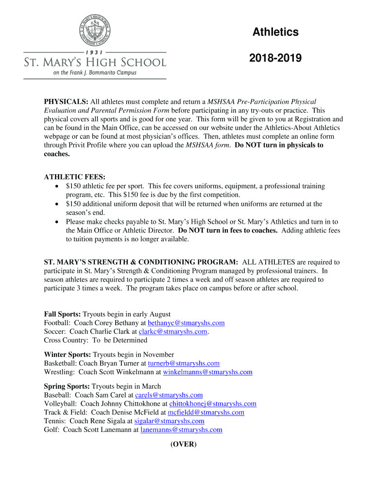 20182019PHYSICALS: All athletes must complete and return an MSH SAA Participation Physical