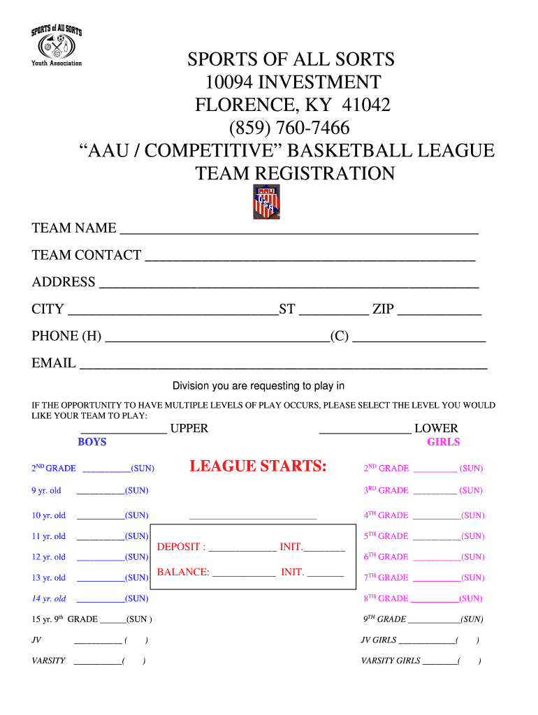 SPORTS OF ALL SORTS 10094 INVESTMENT FLORENCE, KY 41042 (859) 7607466 AAU / COMPETITIVE BASKETBALL LEAGUE TEAM REGISTRATION TEAM NAME TEAM CONTACT ADDRESS CITY ST ZIP PHONE (H) (C) EMAIL Division