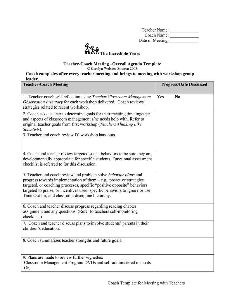 Teacher Name: Coach Name: Date of Meeting: The Incredible Years TeacherCoach Meeting Overall Agenda Template Carolyn WebsterStratton 2008Coach completes after every teacher meeting and brings to meeting