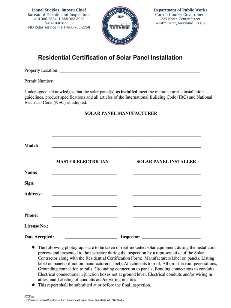 Lionel Sickles, Bureau Chief Bureau of Permits and InspectionsDepartment of Public Works Carroll County Government4103862674, 18883028978 fax 4108769252 MD Relay service 711/8007352258225 North Center
