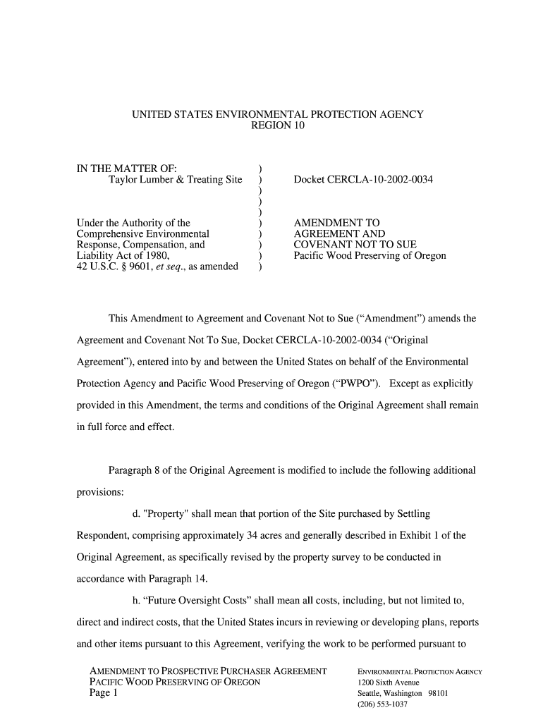 UNITED STATES ENVIRONMENTAL PROTECTION AGENCYREGION 10IN THE MATTER OF: Taylor Lumber & Treating Tender the Authority of the Comprehensive Environmental Response, Compensation, and Liability Act of