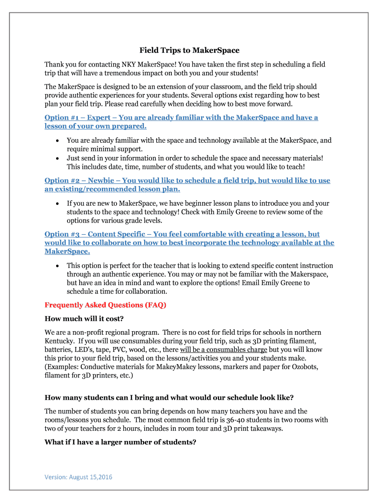 Field Trips to Maker Space Thank you for contacting SKY Maker Space! You have taken the first step in scheduling a field trip that will have a tremendous impact on both you and your students! The