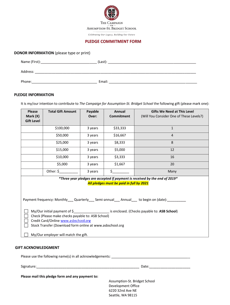 PLEDGE COMMITMENT FORM DONOR INFORMATION (please type or print) Name (First): (Last): Address: Phone: Email: PLEDGE INFORMATION It is my/our intention to contribute to The Campaign for Assumptions.