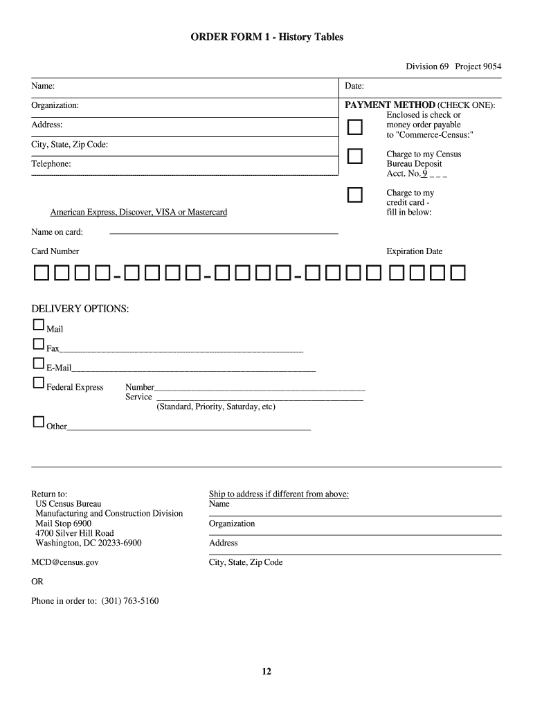 ORDER FORM 1 History Tables Division 69 Project 9054 Name:Date:Organization:PAYMENT METHOD (CHECK ONE):9 9 9Address: City, State, Zip Code: Telephone:American Express, Discover, VISA or MastercardEnclosed