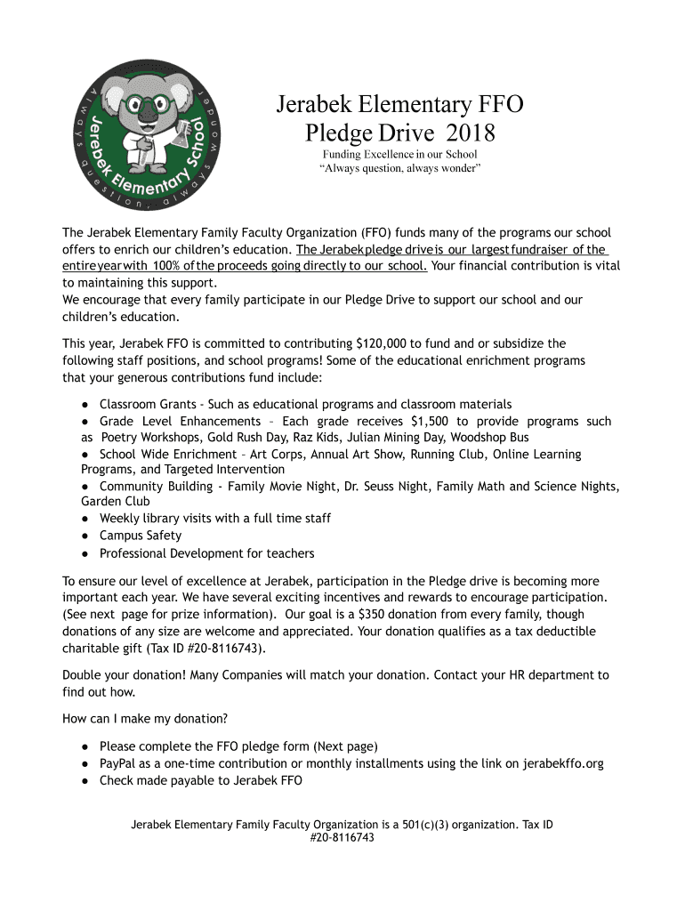 Get the free Pledge DriveJerabek Elementary Family Faculty Organization
