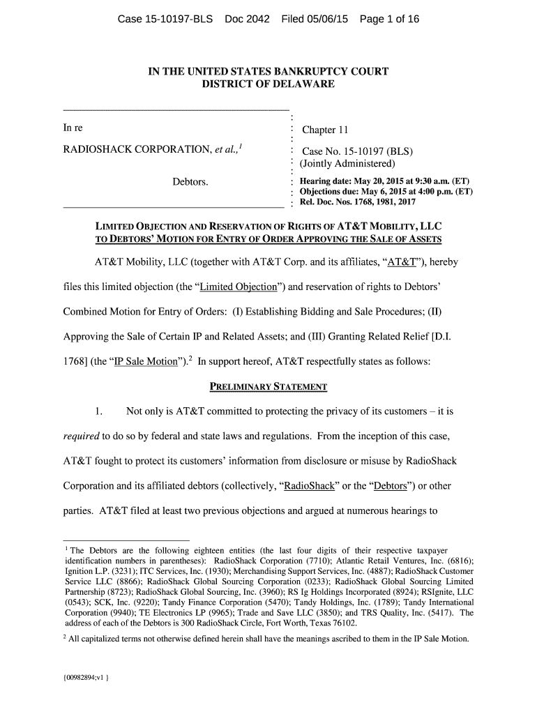 Case 1510197BLSDoc 2042Filed 05/06/15Page 1 of 16IN THE UNITED STATES BANKRUPTCY COURT DISTRICT OF DELAWARE : : : RADIOSHACK CORPORATION, et al.,1 : : : Debtors. : : : In recharter 11 Case No. 1510197