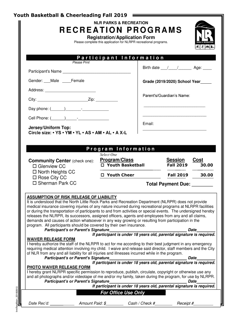 Youth Basketball & Cheerleading Fall 2019 NLR PARKS & RECREATIONRECREATION PROGRAMS Registration/Application Form Please complete this application for NL RPR recreational programs. Participant Information