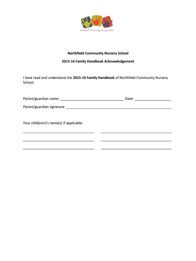 NorthfieldCommunityNurserySchool 201516FamilyHandbookAcknowledgement Ihavereadandunderstandthe201516FamilyHandbookofNorthfieldCommunityNursery School. Parent/guardian name: Date: Parent/guardian signature: