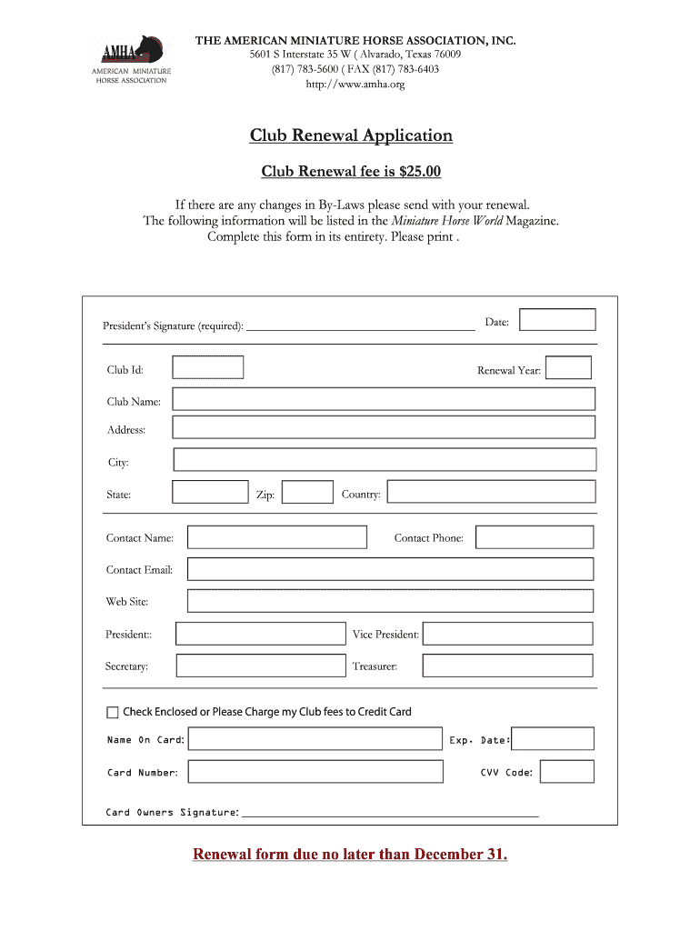 THE AMERICAN MINIATURE HORSE ASSOCIATION, INC. 5601 S Interstate 35 W (Alvarado, Texas 76009 (817) 7835600 (FAX (817) 7836403 http://www.amha.orgClub Renewal Application Club Renewal fee is $25.00