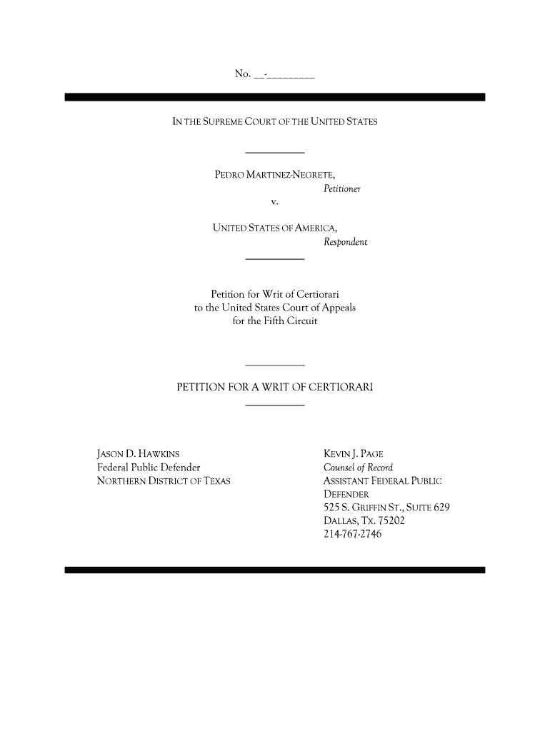 No. IN THE SUPREME COURT OF THE UNITED STATES PEDRO MARTINEZNEGRETE, Petitioner v. UNITED STATES OF AMERICA, Respondent Petition for Writ of Certiorari to the United States Court of Appeals for the