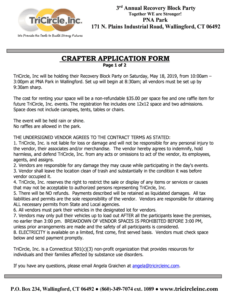 3rd Annual Recovery Block Party Together WE are Stronger!PNA Park 171 N. Plains Industrial Road, Wallingford, CT 06492CRAFTER APPLICATION FORM Page 1 of 2TriCircle, Inc will be holding their Recovery