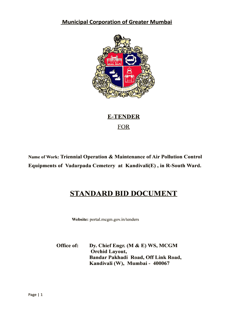Municipal Corporation of Greater MumbaiETENDER Forename of Work: Triennial Operation & Maintenance of Air Pollution ControlEquipments of Vadarpada Cemetery at Sandoval(E), in South Ward. STANDARD
