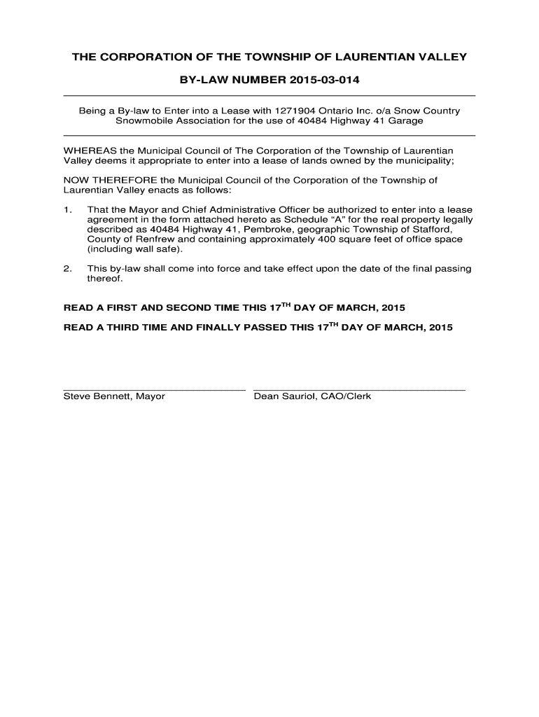 Being a Bylaw to Enter into a Lease with 1271904 Ontario Inc. o/a Snow Country