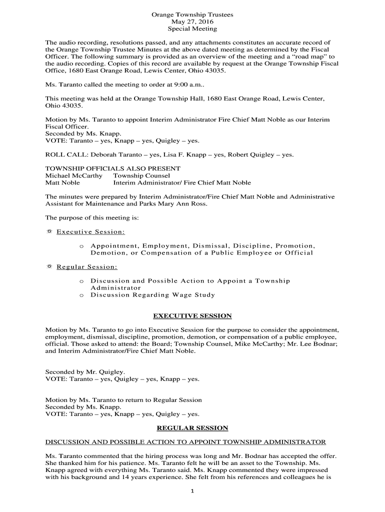 Get the free REGULAR SESSION PUBLIC COMMENT APPROVAL ... - Orange Township