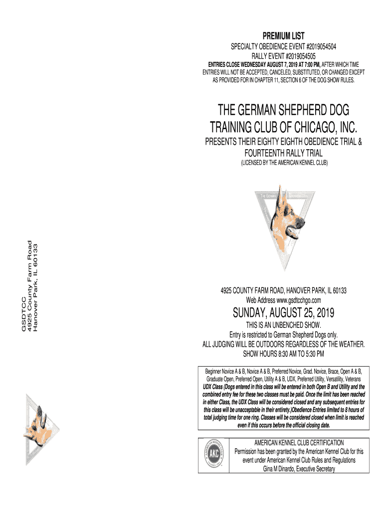 PREMIUM LIST SPECIALTY OBEDIENCE EVENT #2019054504 RALLY Events #2019054505 ENTRIES CLOSE WEDNESDAY, AUGUST 7, 2019, AT 7:00 PM, AFTER WHICH TIME ENTRIES WILL NOT BE ACCEPTED, CANCELED, SUBSTITUTED,