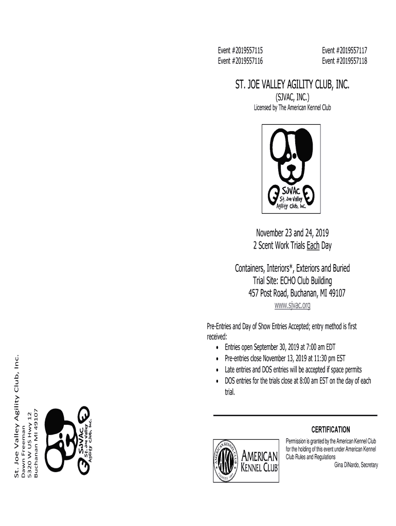 Event #2019557115 Event #2019557116Event #2019557117 Events #2019557118ST. JOE VALLEY AGILITY CLUB, INC. (SJ VAC, INC.) Licensed by The American Kennel Club November 23 and 24, 2019 2 Scent Work Trials