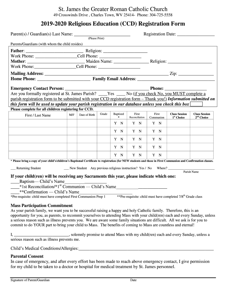 St. James the Greater Roman Catholic Church 49 Crosswinds Drive, Charles Town, WV 25414 Phone: 304725555820192020 Religious Education (CCD) Registration Form Parent(s) / Guardian(s) Last Name:Registration