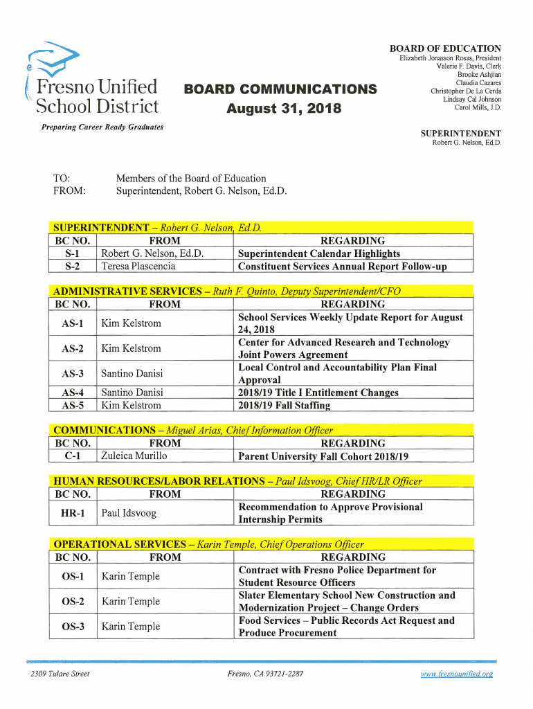 BOARD OF EDUCATION(Fresno Unified School DistrictBOARD COMMUNICATIONS August 31, 2018Elizabeth Jonas son Rosa's, President Valerie F. Davis, Clerk Brooke Asian Claudia Areas Christopher De La CERFA