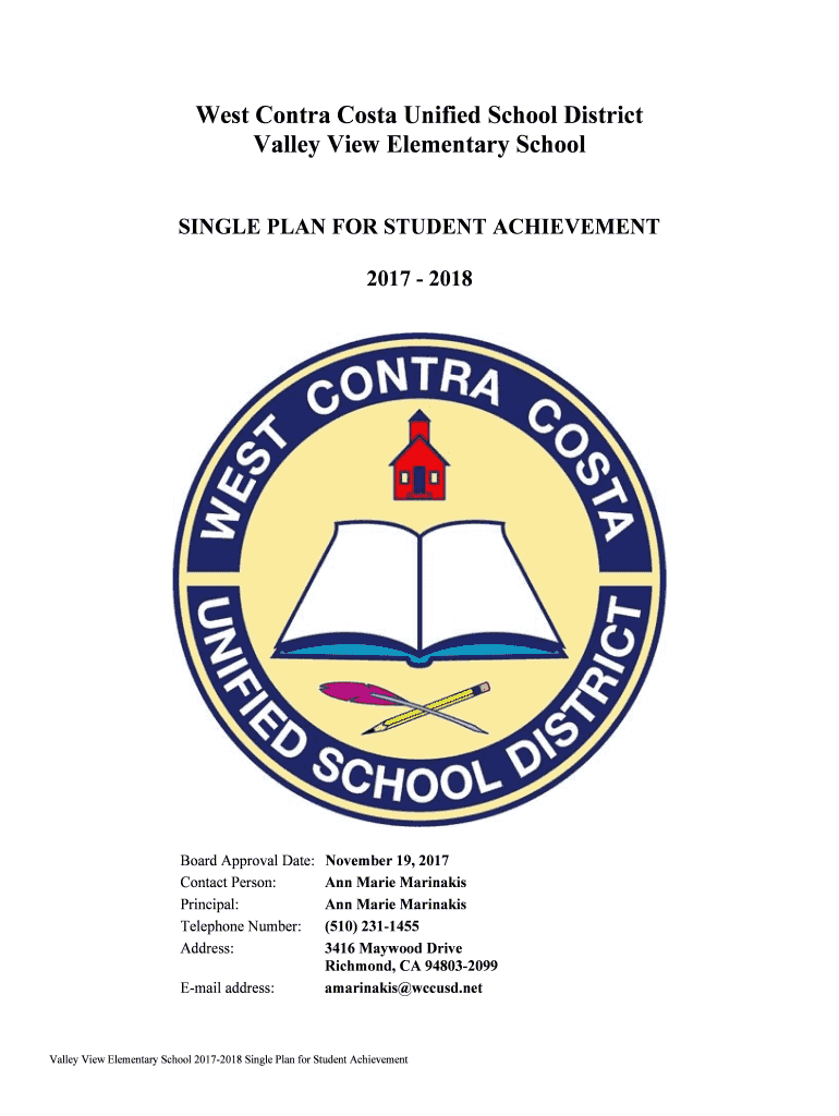 West Contra Costa Unified School District Valley View Elementary School SINGLE PLAN FOR STUDENT ACHIEVEMENT 2017 2018Board Approval Date: Contact Person: Principal: Telephone Number: Address: Email