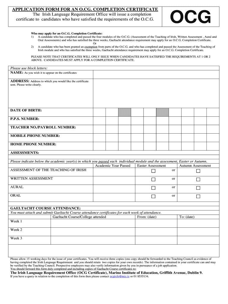 APPLICATION FORM FOR AN O.CG. COMPLETION CERTIFICATE