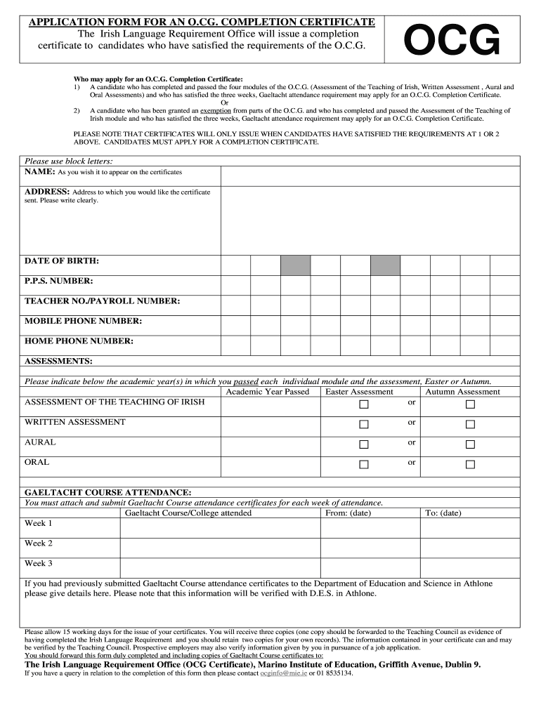 APPLICATION FORM FOR AN O.CG. COMPLETION CERTIFICATE