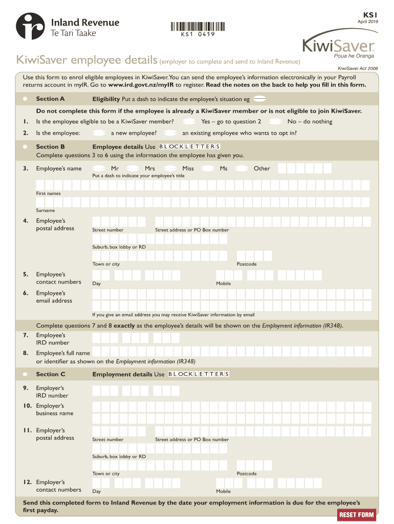 KS1April 2019KS1 0419KiwiSaver employee details (employer to complete and send to Inland Revenue)Kiwi Saver Act 2006Use this form to enrol eligible employees in Kiwi Saver. You can send the employees'
