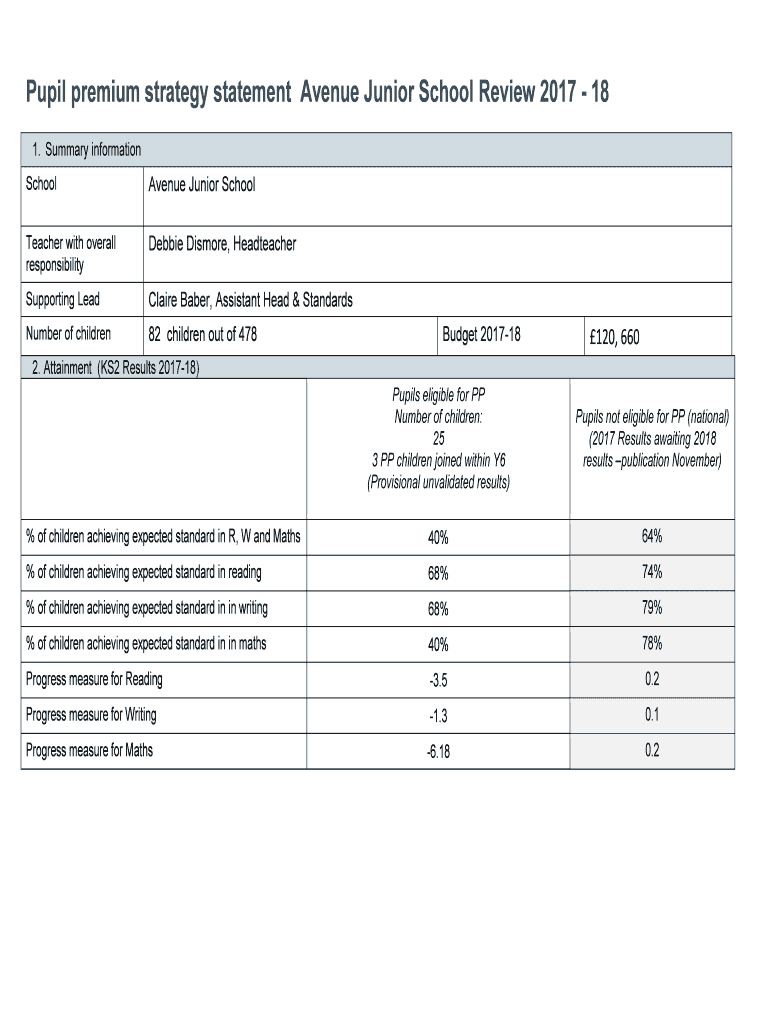 Pupil premium strategy statement Avenue Junior School Review 2017 18 1. Summary information SchoolAvenue Junior Schoolteacher with overall responsibility Debbie Dismore, HeadteacherSupporting Lead