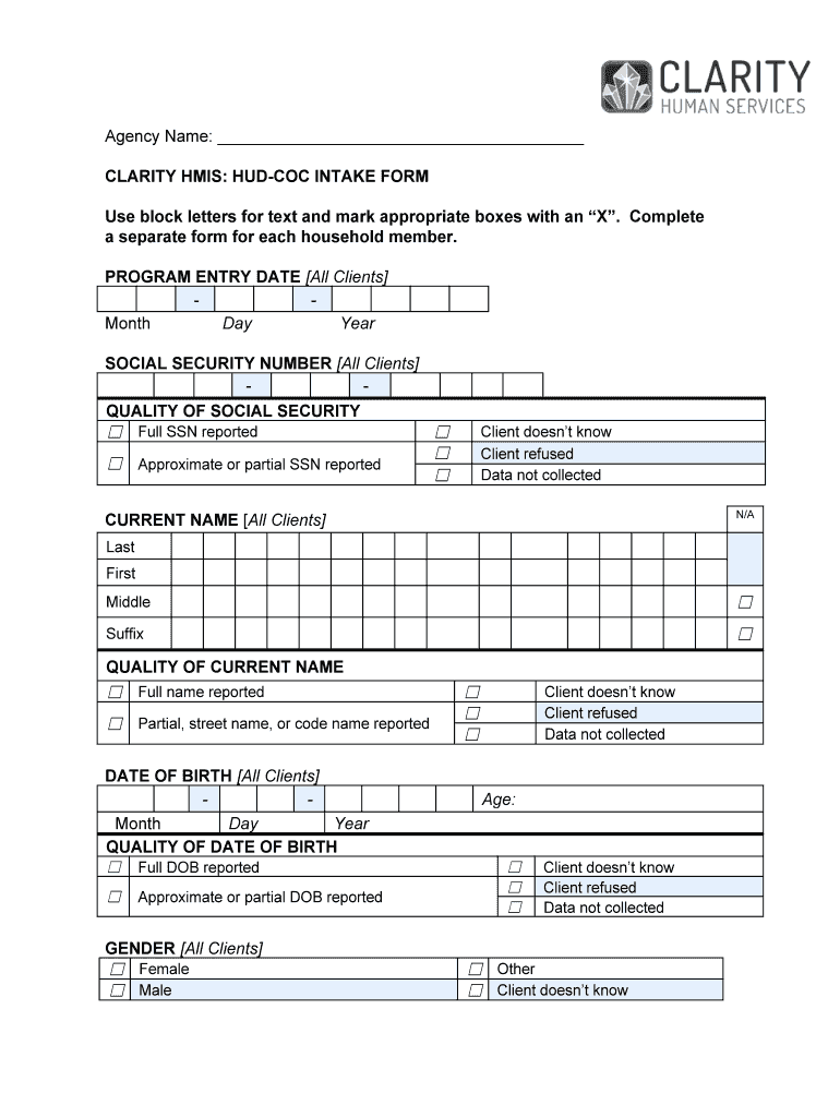 AgencyName: CLARITYHMIS:HUDCOCINTAKEFORM UseblocklettersfortextandmarkappropriateboxeswithanX. Complete aseparateformforeachhouseholdmember. PROGRAMENTRYDATE Clients Month Day Year SOCIALSECURITYNUMBER