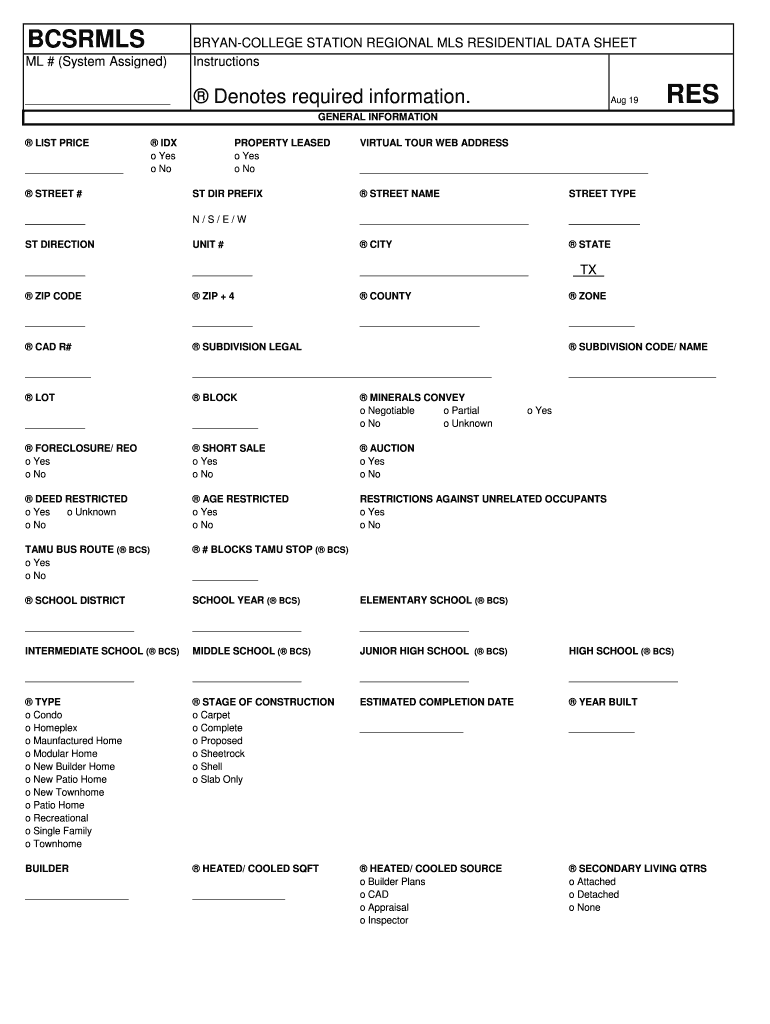 BARRELS ML # (System Assigned)BRYANCOLLEGE STATION REGIONAL MLS RESIDENTIAL DATA SHEET Instructions Denotes required information. Aug 19RESGENERAL INFORMATION LIST PRICE ID o Yes o Property LEASED