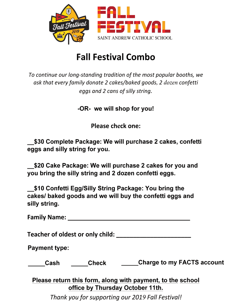 Fall Festival Combo To continue our longstanding tradition of the most popular booths, weak that every family donate 2 cakes/baked goods, 2 dozen confetti eggs and 2 cans of silly string. OR we will