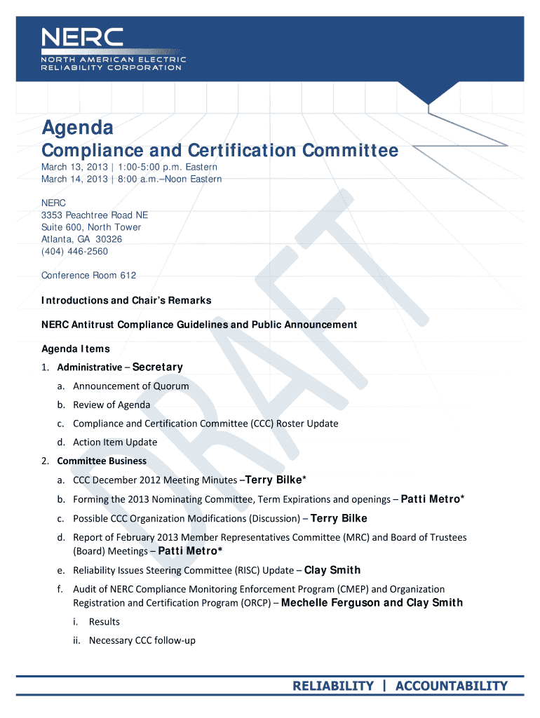 AgendaCompliance and Certification Committee March 13, 2013 1:005:00 p.m. Eastern March 14, 2013 8:00 a.m. Noon Eastern NERC 3353 Peach tree Road NE Suite 600, North Tower Atlanta, GA 30326 (404)