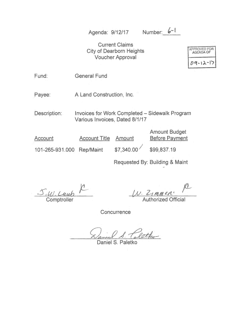 Number:Agenda: 9/12/17(, (Current Claims City of Dearborn Heights Voucher ApprovalAPPROVED FOR AGENDA Offend:General Fundraise:A Land Construction, Inc. Description:Invoices for Work Completed Sidewalk