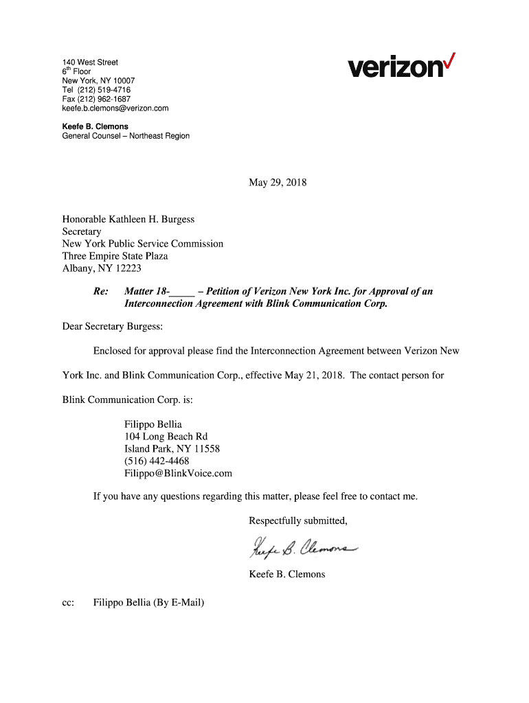 140 West Street TH 6 Floor New York, NY 10007 Tel (212) 5194716 Fax (212) 9621687 Keeffe.b. Clemons verizon.com Keeffe B. Clemons General Counsel Northeast Region May 29, 2018Honorable Kathleen H.
