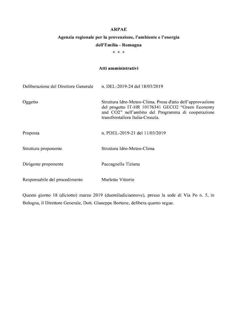 AR PAE Agenda regional per la prevention, l 'ambient e energy dell 'Emilia Romagna * * * Anti amministrativiDeliberazione Del Director Generalen. DEL201924 Del 18/03/2019OggettoStruttura IdroMeteoClima.