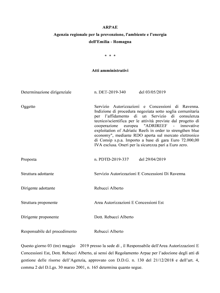AR PAE Agenda regional per la prevention, l 'ambient e energy dell 'Emilia Romagna * * * Anti amministrativiDeterminazione dirigenzialen. DET2019340OggettoServizio Autorizzazioni e Concession di Ravenna.