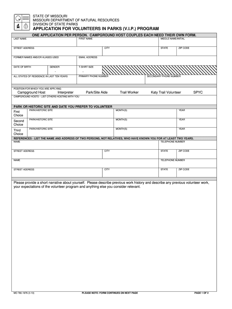 Get the free APPLICATION FOR VOLUNTEERS IN PARKS (V - Missouri State Parks
