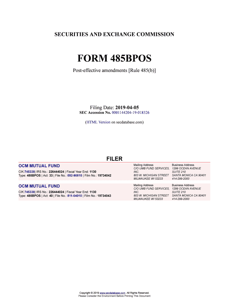 Get the free OCM MUTUAL FUND Form 485BPOS Filed 2019-04-05. Accession Number