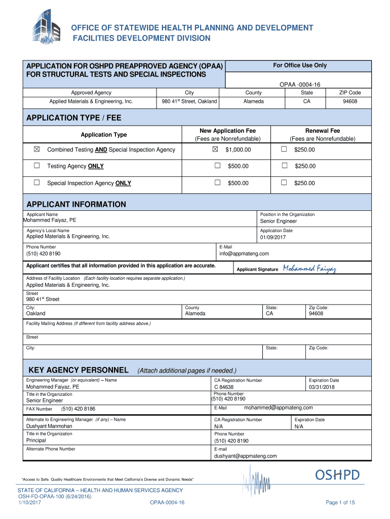 Get the free OSHPD Preapproved Agency (OPAA). Applied Materials & Engineering - oshpd ca