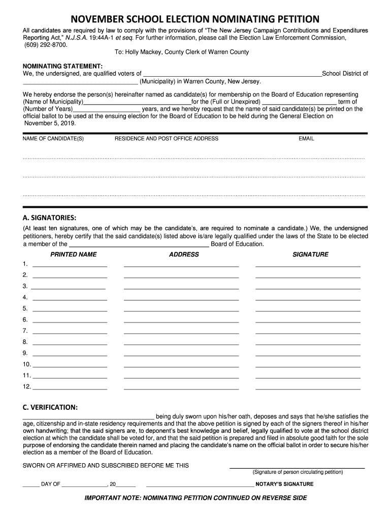 NOVEMBER SCHOOL ELECTION NOMINATING PETITION All candidates are required by law to comply with the provisions of The New Jersey Campaign Contributions and Expenditures Reporting Act, N.J.S.A. 19:44A1