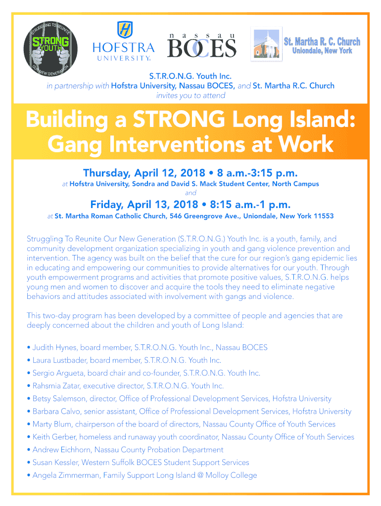 S.T.R.O.N.G. Youth Inc. in partnership with Host University, Nassau BONES, and St. Martha R.C. Church invites you to attendBuilding a STRONG Long Island: Gang Interventions at Work Thursday, April