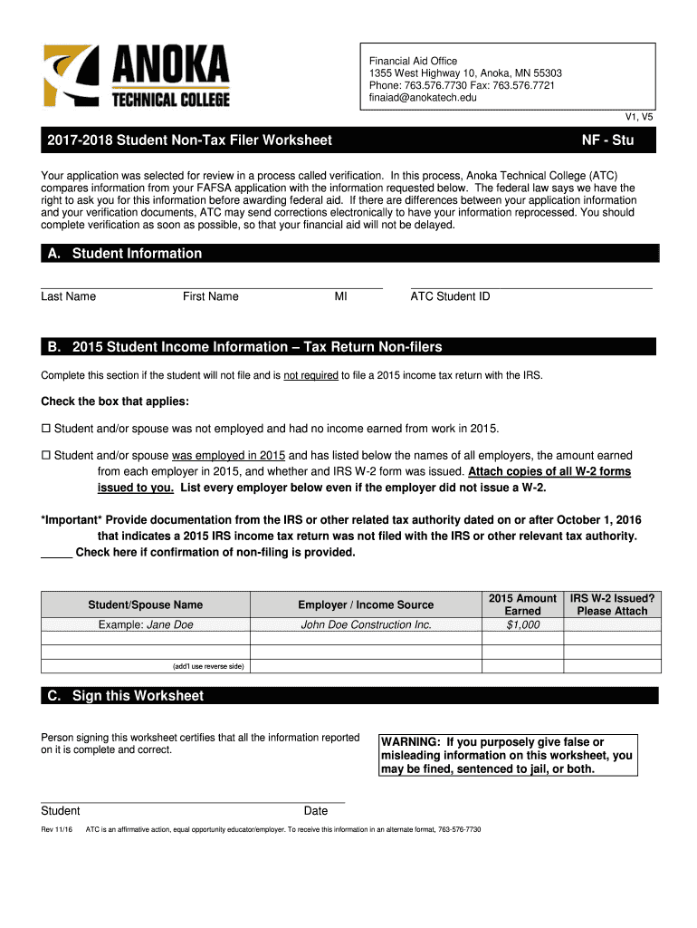 Financial Aid Office 1355 West Highway 10, ANOVA, MN 55303 Phone: 763.576.7730 Fax: 763.576.7721 finial nanotech.edu V1, V520172018 Student Syntax Filer Worksheet NF Stupor application was selected