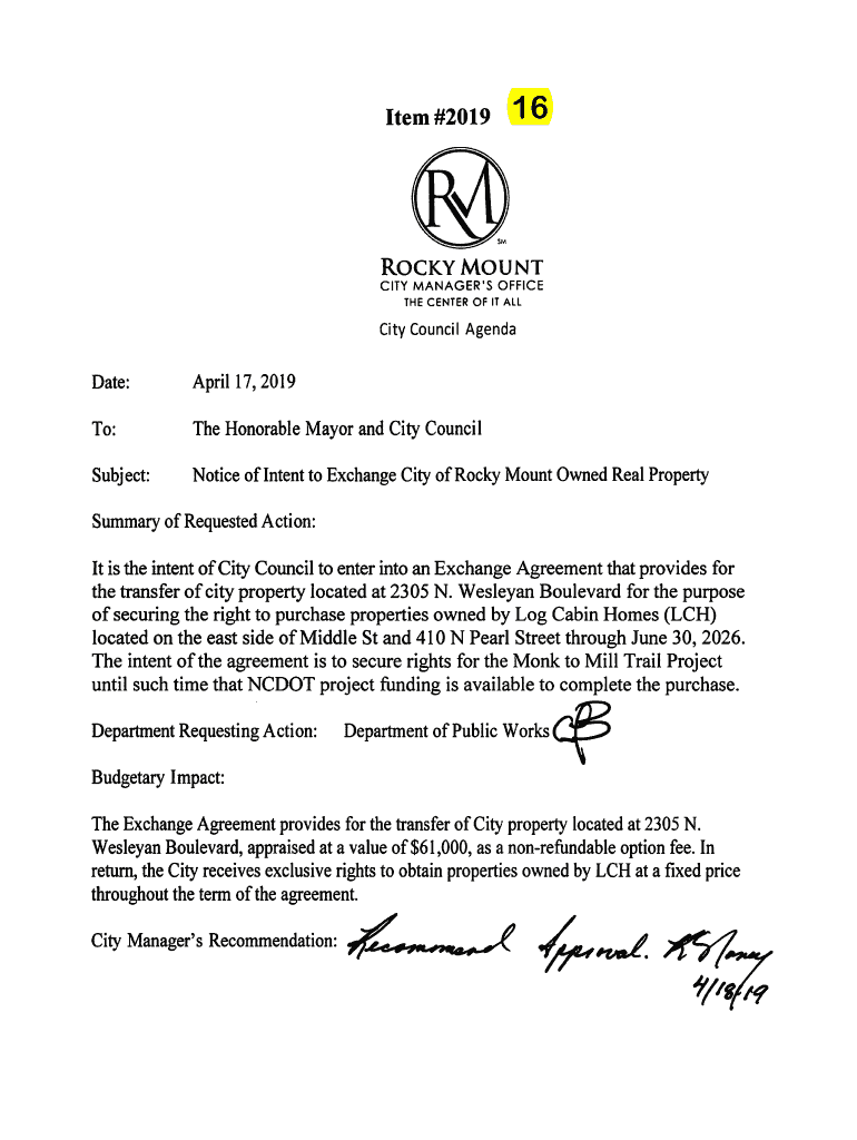 THE CENTER OF IT Alacrity Council I AgendaDate:April 17, 2019To:The Honorable Mayor and City CouncilSubject:Notice of Intent to Exchange City of Rocky