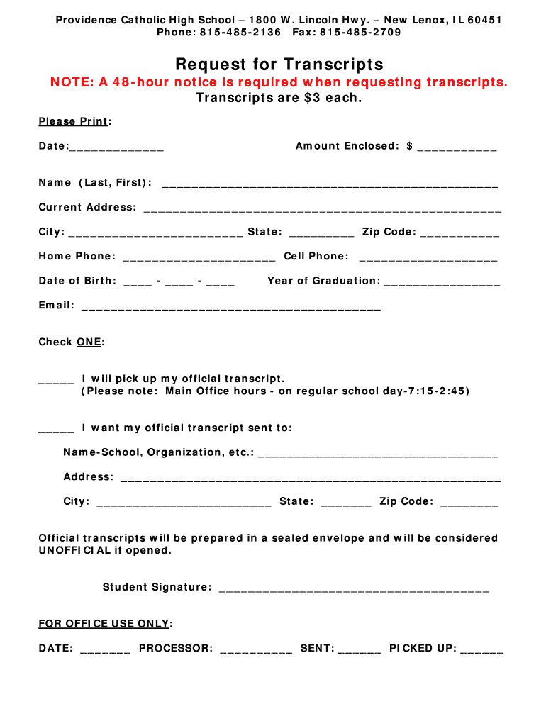 Providence Catholic High School 1800 W. Lincoln Hwy. New Lenox, IL 60451 Phone: 8154852136 Fax: 8154852709Request for Transcripts NOTE: A 48hour notice is required when requesting transcripts. Transcripts