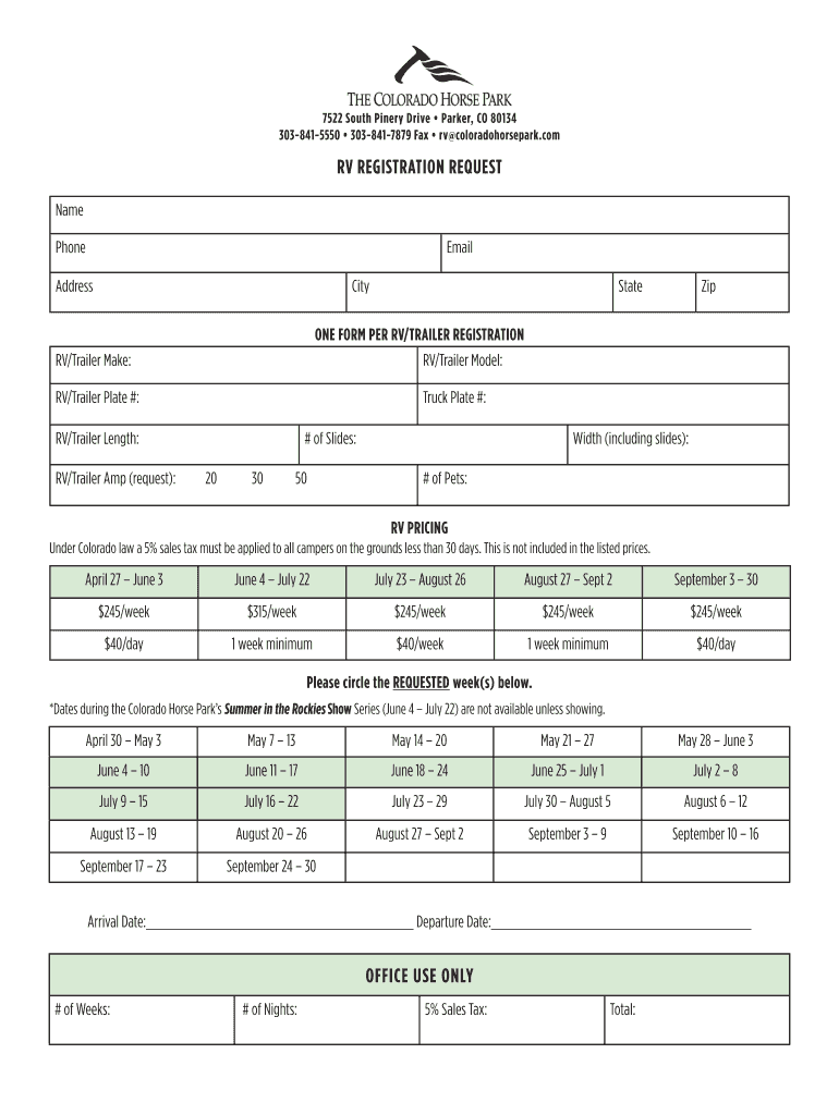 7522 South Winery Drive Parker, CO 80134 3038415550 3038417879 Fax RV coloradohorsepark.com RV REGISTRATION REQUEST Name PhoneEmailAddressCityStateZipONE FORM PER RV/TRAILER REGISTRATION RV/Trailer