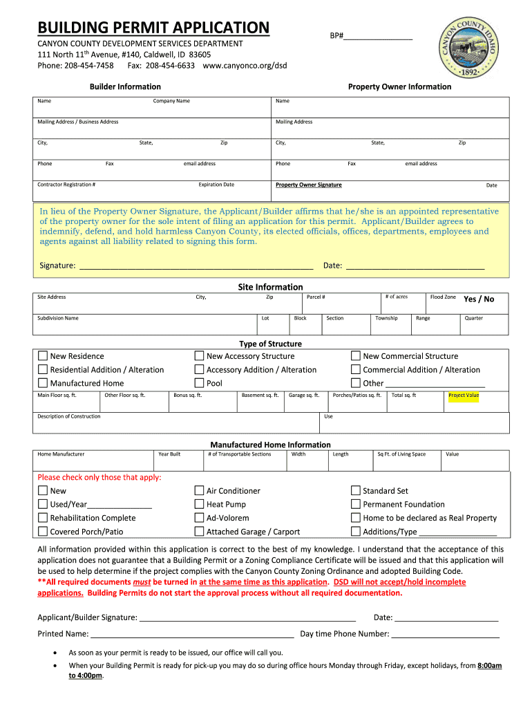 BUILDING PERMIT APPLICATION BP# CANYON COUNTY DEVELOPMENT SERVICES DEPARTMENT 111 North 11th Avenue, #140, Caldwell, ID 83605 Phone: 2084547458 Fax: 2084546633 www.canyonco.org/dsd Builder Information