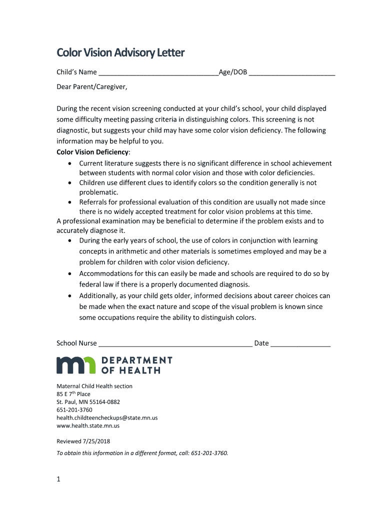Color Vision Advisory Letter Child's Name Age/DOB Dear Parent/Caregiver, During the recent vision screening conducted at your children school, your child displayed some difficulty meeting passing