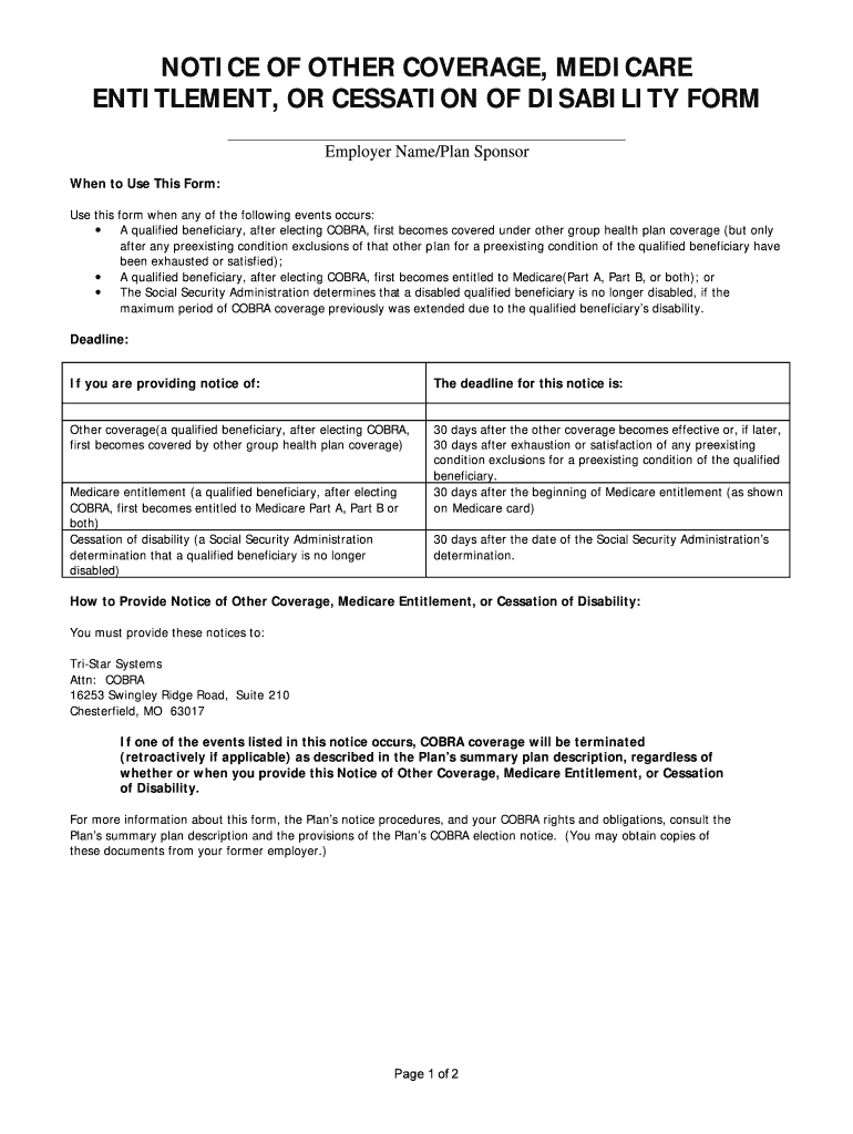 NOTICE OF OTHER COVERAGE, MEDICARE ENTITLEMENT, OR CESSATION OF DISABILITY FORM Employer Name/Plan Sponsor When to Use This Form: Use this form when any of the following events occurs: A qualified